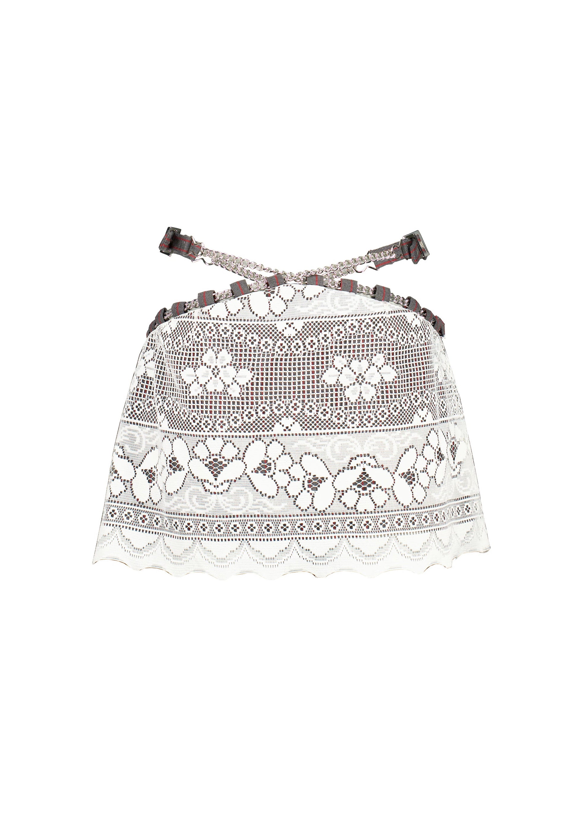 Introducing the Mitte Skirt, a contemporary mini that fuses structured wool with delicate upcycled lace curtain...